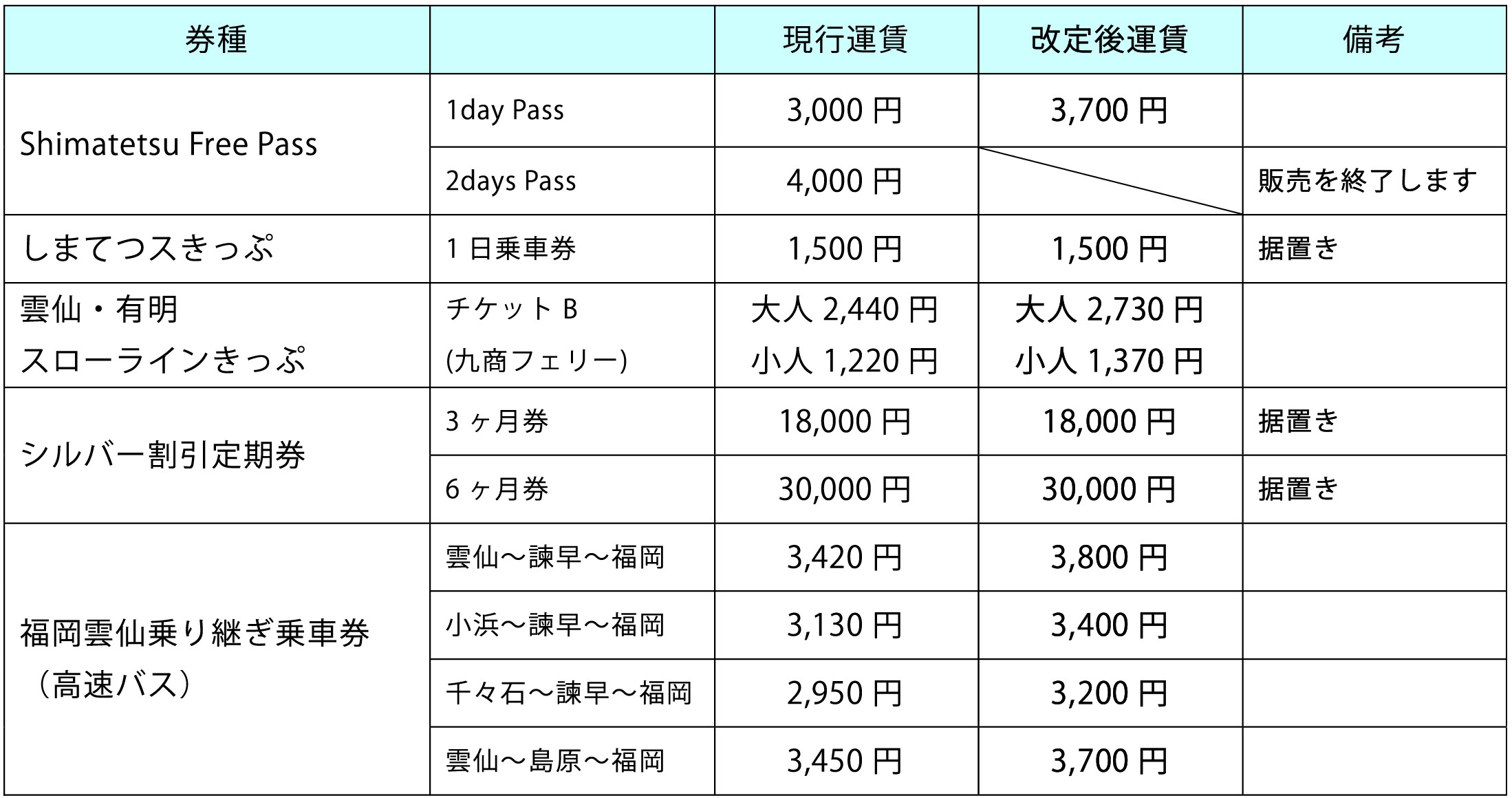 ・3月31日までにご購入されましたShimatetsu Free Pass(1day Pass)及び雲仙・有明スローラインきっぷにつきましては、4月1日以降にご利用される場合は、改定後運賃(新運賃)が適用されるため、窓口等にて差額運賃を添えて新運賃適用後の乗車券への交換をお願いいたします。