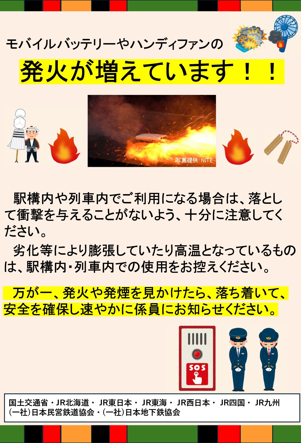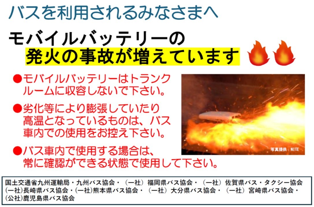 いつも島原鉄道・島鉄バスをご利用いただきありがとうございます。モバイルバッテリーが原因の火災や事故防止のため、ご利用のお客さまへ下記のとおりお願いです。